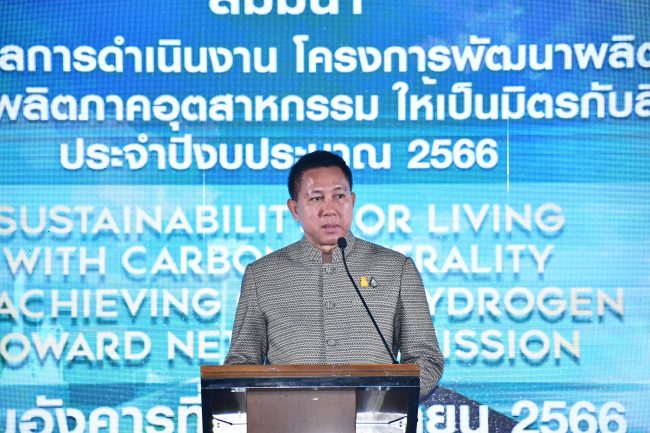 เมื่อเวลา 09.00 น.วันที่ 12 กันยายน 2566 ณ ห้องแสนสุข แกรนด์ ฮอลล์ โรงแรมบางแสนเฮอริเทจ อำเภอเมืองชลบุรี จังหวัดชลบุรี นายธวัชชัย ศรีทอง ผู้ว่าราชการจังหวัดชลบุรี เป็นประธานในพิธีเปิดงานสัมมนาเผยแพร่ผลการดำเนินงานโครงการพัฒนาผลิตภัณฑ์และกระบวนการผลิตภาคอุตสาหกรรมให้เป็นมิตรกับสังคมและสิ่งแวดล้อม ประจำปีงบประมาณ พ.ศ.2566 (SUSTAINABILITY FOR LIVING WITH CARBON NEUTRALITY IN ACHIEVING GREEN HYDROGEN TOWARD NET ZERO EMISSION)