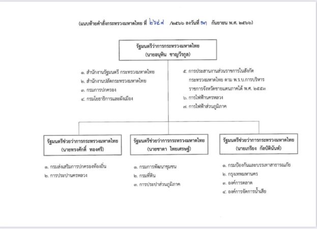 เมื่อวันที่ 13 กันยายน 2566 นางสาวไตรศุลี ไตรสรณกุล เลขานุการรัฐมนตรีว่าการกระทรวงมหาดไทย เปิดเผยว่า นายอนุทิน ชาญวีรกูล รมว.มหาดได้ลงนามคำสั่งกระทรวงมหาดไทย มอบหมายอำนาจหน้าที่ให้รัฐมนตรีช่วยว่าการกระทรวงมหาดไทยปฏิบัติราชการแทนรัฐมนตรีว่าการกระทรวงมหาดไทย ภายหลังจากที่ได้มีพระบรมราชโองการโปรดเกล้าโปรดกระหม่อมแต่งตั้งรัฐมนตรี เมื่อวันที่ 1 กันยายน 2566