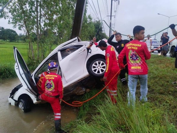 อำนาจเจริญ-ครูหนุ่มบรรจุใหม่ขับเก๋งฝนตก ถนนลื่นรถเสียหลักพุ่งชนเสาไฟฟ้าดับคาที่ ขณะกำลังไปรายงานตัวบรรจุเป็นข้าราชการครูที่จังหวัดกาฬสินธุ์