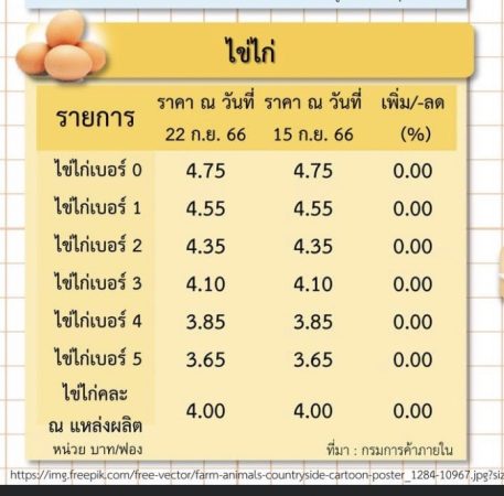 ตัวเลขราคาไข่ไก่ที่สมาชิกสภาผู้แทนราษฎรท่านหนึ่งเอ่ยถึงในสภาฯ ดูจะคลาดเคลื่อนไปจากความเป็นจริง เพราะเมื่อนำมาเทียบกับราคาไข่ไก่ที่รวบรวม ณ วันที่ 29 กันยายน 2566 พบว่าแตกต่างกันชัดเจน เช่น ไข่ไก่ เบอร์ 3-4 ที่ระบุว่ามีราคา 137 บาท/แผง (30 ฟอง) ขณะที่ข้อเท็จจริงอยู่ที่ 127-132 บาท/แผง หรือ ไข่ไก่เบอร์ 2-3 ที่ระบุว่าราคาแผงละ 165 บาท แต่ข้อเท็จจริงราคากลับอยู่ที่แผงละ 132-135 บาท ขณะเดียวกัน หากพิจารณาข้อมูลของกรมการค้าภายในก็ระบุว่าราคาไข่ไก่อยู่ในระดับเดียวกับที่สำรวจตลาดมา โดยไม่มีการขยับขึ้นมา ตั้งแต่วันที่ 15 กันยายน 2566 แล้ว