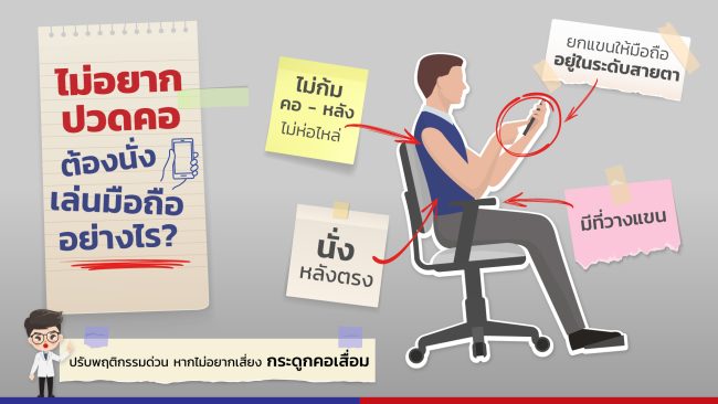นพ.ศิรวิชญ์ เผยอีกว่า ในปัจจุบันคนส่วนใหญ่ที่ใช้งานโทรศัพท์ไม่ได้อยู่ในท่าที่ถูกต้อง แต่จะก้มหน้าเล่นโทรศัพท์เป็นเวลานานเกิน 2 ชั่วโมง ไม่ว่าจะเป็นการทำงาน หรือการดูซีรีส์ต่างต้องใช้เวลารับชมที่ค่อนข้างนาน และอยู่ในท่าทางที่ไม่ถูกต้อง ยกตัวอย่างการที่เราจะดูซีรีส์ในแต่ละครั้ง ต้องใช้ระยะเวลาในการรับชมที่ค่อนข้างนาน และไม่ว่าจะอยู่ในท่านั่งหรือท่านอน โดยไม่ได้เปลี่ยนอิริยาบถ ต่างก็ทำให้ร่างกายเกิดอาการปวดขึ้นได้จากท่าท่างที่ไม่ถูกต้อง ส่งผลให้เซลล์อักเสบเกิดขึ้นจนร่างกายเริ่มหาตัวช่วย โดยการดึงเอาแคลเซียมที่อยู่ในเลือดเข้ามารักษาในบริเวณที่เกิดการบาดเจ็บ เมื่อเราอยู่ในท่าเดิมซ้ำๆ โดยไม่ได้เปลี่ยนอิริยาบถจนเป็นพฤติกรรมที่เคยชิน ส่งผลทำให้เกิดโรคกระดูกคอเสื่อมตามมา