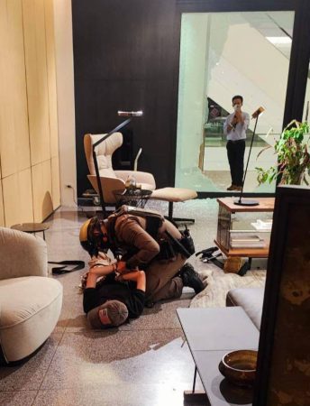 ขณะที่คนร้ายแต่งกายมิดชิด สวมหมวกแก๊บเดินถือปืนอยู่ในห้าง เจ้าหน้าที่ตำรวจและเจ้าหน้าที่ที่เกี่ยวข้องสามารถควบคุมสถานการณ์ได้แล้ว โดยเบื้องต้นมีผู้บาดเจ็บ 3 ราย เป็นเจ้าหน้าที่ รปภ.ของห้าง ถูกนำตัวส่ง รพ.หัวเฉียว ส่วนอีก 2 ราย ถูกนำตัวส่งโรงพยาบาลใกล้เคียง