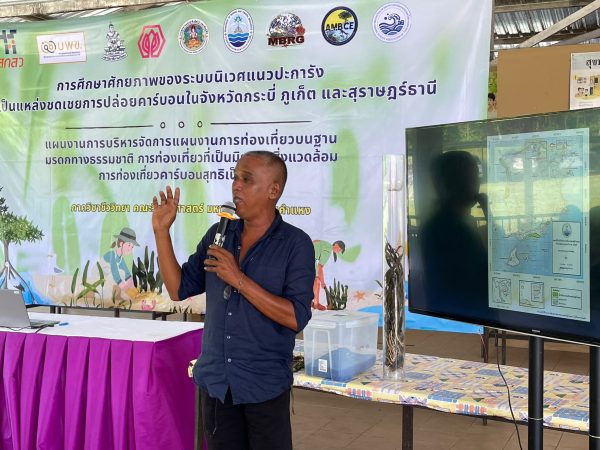 รองศาสตราจารย์ ดร.ธรรมศักดิ์ ยีมิน กลุ่มวิจัยความหลากหลายทางชีวภาพในทะเล ภาควิชาชีววิทยา คณะวิทยาศาสตร์ มหาวิทยาลัยรามคำแหง และผู้อำนวยการแผนงานท่องเที่ยวบนฐานมรดกทางธรรมชาติ การท่องเที่ยวที่เป็นมิตรกับสิ่งแวดล้อม และการท่องเที่ยวคาร์บอนสุทธิเป็นศูนย์ พร้อมด้วยผู้ช่วยศาสตราจารย์ ดร.มาฆมาส สุทธาชีพ อาจารย์ ดร.วิชิน สืบปาละ ดร.สิทธิพร เพ็งสกุล ดร.เจริญมี แช่มช้อย และนักวิจัยภายใต้แผนงานฯ จัดกิจกรรมการอนุรักษ์และฟื้นฟูแหล่งหญ้าทะเลในการดูดซับคาร์บอน ณ โรงเรียนเทศบาล ๔ (วัดคีรีมาส) อำเภอเกาะสมุย จังหวัดสุราษฎร์ธานี โดยนำเสนอผลการศึกษาการกักเก็บคาร์บอนของระบบนิเวศแนวปะการังหลายแห่งในจังหวัดสุราษฎร์ธานี ซึ่งมีศักยภาพการกักเก็บคาร์บอนในแนวทรายบริเวณน้ำตื้น หญ้าทะเลบริเวณน้ำตื้น แนวทรายระหว่างหญ้าทะเลกับแนวปะการัง สาหร่ายทะเล พื้นตะกอนบริเวณกลุ่มสิ่งมีชีวิตปะการัง หญ้าทะเลบริเวณน้ำลึก และแนวทรายบริเวณน้ำลึก