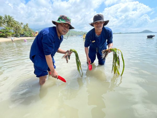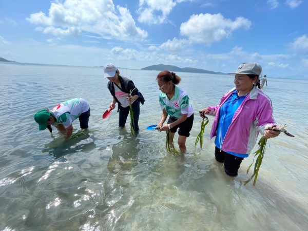 ผู้เข้าร่วมประชุมดำเนินการปลูกหญ้าทะเลเพื่อเพิ่มแหล่งดูดซับคาร์บอนบริเวณอ่าวท้องโตนด โดยมีคุณณัฐวดี บันติวิวัฒน์กุล นักวิชาการประมงชำนาญการพิเศษ กรมทรัพยากรทางทะเลและชายฝั่ง และผู้แทนจากหน่วยงานต่าง ๆ เช่น กรมทรัพยากรทางทะเลและชายฝั่ง กรมอุทยานแห่งชาติ สัตว์ป่า และพันธุ์พืช กรมเจ้าท่า องค์การบริหารส่วนจังหวัดสุราษฎร์ธานี องค์กรปกครองส่วนท้องถิ่น การท่องเที่ยวแห่งประเทศไทย ผู้ประกอบการท่องเที่ยว ชุมชนท้องถิ่น โรงเรียน ฯลฯ เข้าร่วมกิจกรรม