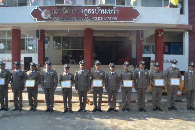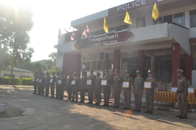 เวลา 8:00 น ข้าราชการตำรวจทุกนาย เข้าแถวบริเวณหน้าเสาธงที่ทำการสถานีตำรวจภูธรบ้านเขว้า เพื่อร่วมรับฟังสารจากผู้บัญชาการตำรวจแห่งชาติ และกล่าวคำปฏิญาณ ของการทำหน้าที่ข้าราชการตำรวจไทย โดยพร้อมเพียงกัน ในการนี้ พ.ต.อ.อานุภาพ ผิวอ่อน ผกก.สภ.บ้านเขว้า ได้เชิญแขกผู้มีเกียรติที่ได้ให้การสนับสนุน ในการทำกิจกรรมปรับภูมิทัศน์ก่อสร้างรั้วสถานีตำรวจภูธรบ้านเขว้า จนกระทั่งแล้วเสร็จในปัจจุบันนี้ จึงได้มีการมอบใบประกาศนียบัตรแทนคำขอบคุณใ้กับผู้ที่ให้การสนับสนุน