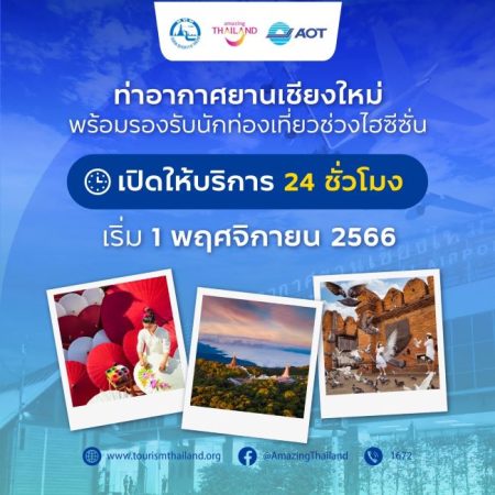 ทั้งนี้ ทอท. จะเปิดให้บริการท่าอากาศยานเชียงใหม่ ตลอด 24 ชั่วโมง ตั้งแต่วันที่ 1 พฤศจิกายน 2566 เป็นต้นไป จากเดิมที่เปิดให้บริการ 18 ชั่วโมงต่อวัน หรือตั้งแต่เวลา 06.00 – 24.00 น. เพื่อรองรับจำนวนเที่ยวบินและจำนวนนักท่องเที่ยวคุณภาพที่จะเดินทางเข้ามายังประเทศไทยเพิ่มขึ้นในช่วงไฮซีซั่น ปลายปี 2566 โดย ทอท. อยู่ระหว่างเตรียมความพร้อมทั้งสิ่งอำนวยความสะดวก เจ้าหน้าที่ และระบบคมนาคมขนส่ง รวมทั้งจัดสรรพื้นที่ภายในท่าอากาศยานฯ แก่วิสาหกิจชุมชน เพื่อจัดจำหน่ายผลิตภัณฑ์ท้องถิ่นแก่นักท่องเที่ยว และสร้างรายได้ให้กับเศรษฐกิจฐานรากอย่างทั่วถึง ตลอดจนประสานงานร่วมกับสายการบินและหน่วยงานที่เกี่ยวข้อง เพื่อพิจารณาจัดตารางการบินให้เหมาะสม เพื่อลดผลกระทบต่อชุมชนโดยรอบ พร้อมกำหนดมาตรการดูแลเยียวยาผู้ที่ได้รับผลกระทบด้วย