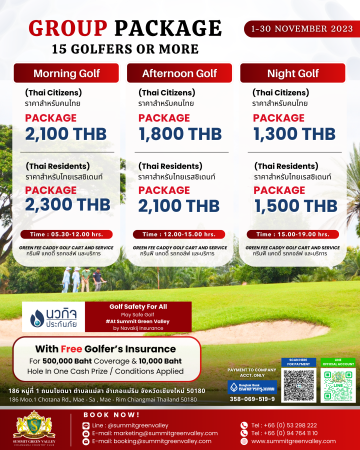 สำหรับแพคเก็จประกันพิเศษประกันนักกอล์ฟรายรอบ คุ้มครองนักกอล์ฟด้วยกรมธรรม์ที่วงเงินคุ้มครองกว่า 500,000 บาท จะเริ่มตั้งแต่ วันที่ 1 พฤศจิกายน 2566 ถึง 31 ธันวาคม 2567 สำหรับนักกอล์ฟที่มาออกรอบที่สนามซัมมิท กรีน วัลเล่ย์ ทุกๆ ท่าน ทั้งชาวไทยและต่างประเทศ