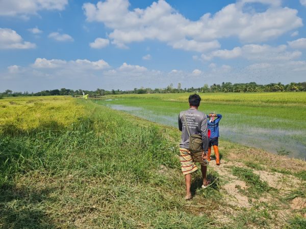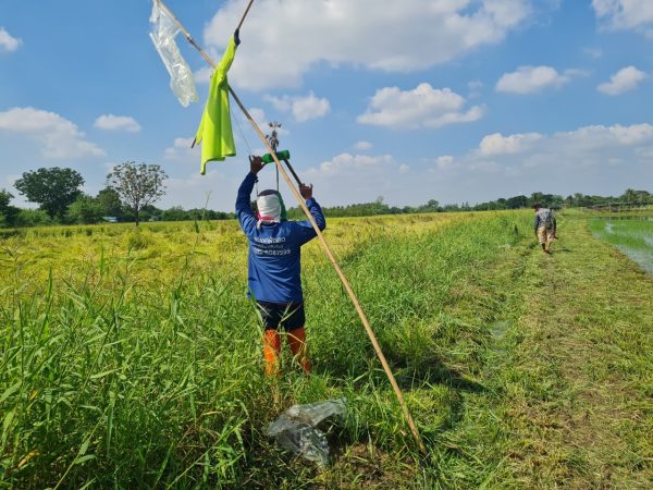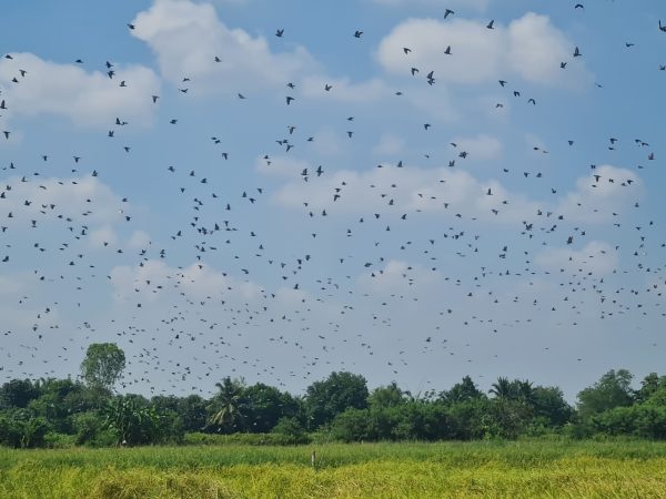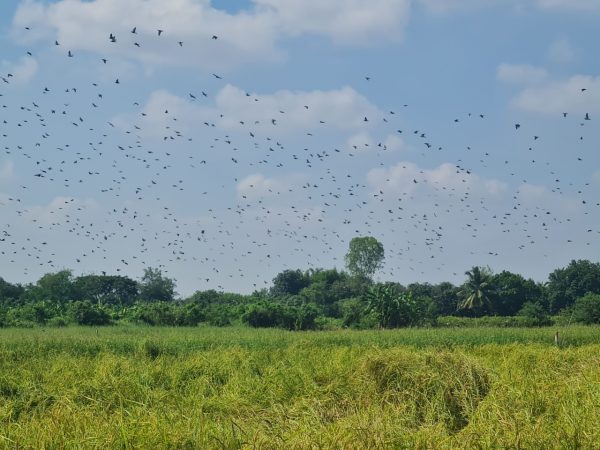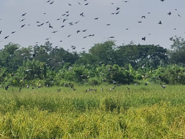 เนื่องจากน้ำหนักจากรวงของข้าวเปลือกเนื่องจากต้นข้าวที่ล้มนั้นฝูงนกพิราบจะลงมากินง่าย จึงทำให้ในช่วงนี้ตนต้องใช้เวลาตลอดทั้งวันตั้งแต่เช้าจรดเย็นนั่งเฝ้านาข้าวของตนเพื่อคอยไล่ฝูงนกพิราบนับพันตัวที่บินวนคอยที่จะบินลงมากินข้าวเปลือก ซึ่งถ้าไม่คอยไล่ฝูงนกพิราบเหล่านี้จะทำลายผลผลิตเสียหายเป็นจำนวนมาก.