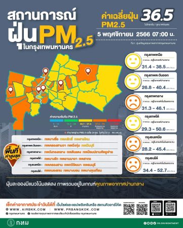 เมื่อวันที่ 5 พ.ย. 2566 ศูนย์ข้อมูลคุณภาพอากาศกรุงเทพมหานครขอสรุปผลการตรวจวัด PM2.5 วันที่ 5 พฤศจิกายน 2566เวลา 05.00-07.00 น. (3 ชั่วโมงล่าสุด)