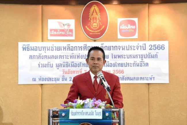 สภาสังคมสงเคราะห์แห่งประเทศไทย ในพระบรมราชูปถัมภ์ ร่วมกับ มูลนิธิเมืองไทยยิ้ม จัดพิธีมอบทุนช่วยเหลือการศึกษาเด็กยากจนประจำปี 2566 ให้แก่เด็กและเยาวชนที่ด้อยโอกาส โดยมี ร้อยตำรวจโท ดร. มนัส โนนุช ประธานสภาสังคมสงเคราะห์ฯ เป็นประธานในพิธี พร้อมด้วย พลตรีหญิง คุณหญิงอัสนีย์ เสาวภาพ ประธานที่ปรึกษาคณะกรรมการอำนวยการสภาสังคมสงเคราะห์ฯ ร่วมมอบทุน