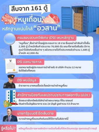 ทั้งนี้ DSI ยังได้ทำงานร่วมกับสำนักงานป้องกันและปราบปรามการฟอกเงิน (ปปง.) ตรวจสอบเส้นทางการเงิน ตลอดจนทั้งยึดและอายัดทรัพย์ของกลุ่มบริษัทนำเข้าและกลุ่มนายทุน จากคดีหมูเถื่อน 161 ตู้ ที่ถูกจับกุมตั้งแต่เดือนกรกฎาคม 2566 ที่มีทั้งที่ดิน รถยนต์ เงินฝากในบัญชีธนาคาร มูลค่ารวม 53 ล้านบาท