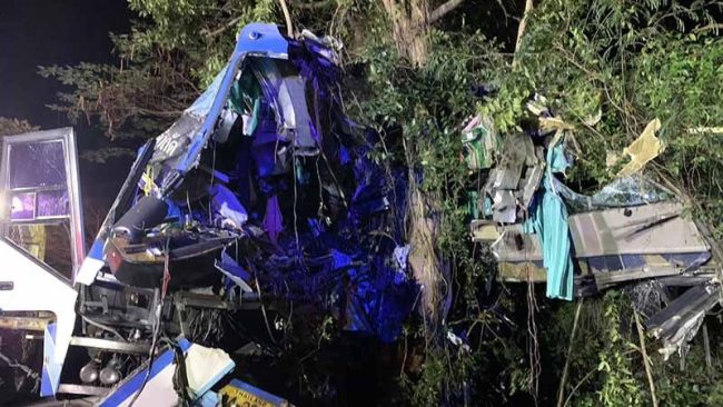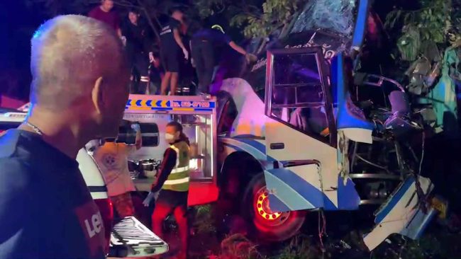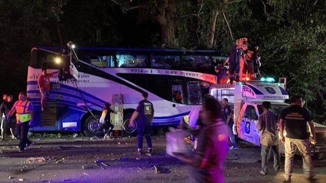 ประจวบคีรีขันธ์-รถทัวร์โดยสาร กรุงเทพฯ-นาทวี หลับในพุ่งชนต้นไม้สนั่นพังยับ เสียชีวิตคาซากรถ 14 ศพ เจ็บ 35 ราย จนท.เร่งนำส่ง รพ. เบื้องต้นยังไม่ทราบสาเหตุ