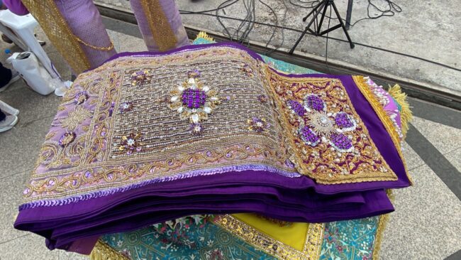 โดยนางพัชรินทร์ นพคุณางกูล อายุ 67 ปี อาจารย์บำนาญ คนทำผ้าสไบ เปิดเผยว่า ตนได้มีโอกาสทำสไบสำหรับห่มย่าโมในช่วงพิธีเปิดงานฉลองวันแห่งชัยชนะของท้าวสุรนารีมา 8 ปี ต่อเนื่องแล้ว โดยในแต่ละปีก็จะมีสีสันแตกต่างกันไปในแต่ละปีแล้วแต่สีประจำวันที่ตรงกับวันที่ 23 มีนาคม ที่เป็นวันเปิดงาน โดยในปีนี้ตรงกับวันเสาร์ซึ่งสีประจำวันคือสีม่วง โดยผ้าสไบผืนนี้ใช้เวลาในการทำประมาณ 2 เดือนเนื่องจากตนทำคนเดียวและมีความยากในการทำ ซึ่งตนรู้สึกภูมิใจในฐานะที่เป็นคนโคราชที่ได้มีอากาสทำผ้าสไบสำหรับห่มย่าโม.