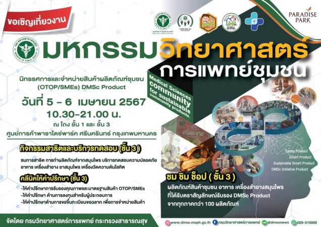 การจัดมหกรรมวิทยาศาสตร์การแพทย์ชุมชน ของกรมวิทยาศาสตร์การแพทย์ กระทรวงสาธารณสุข จัดขึ้นระหว่างวันที่ 5-6 เมษายน 2567 นี้ เวลา 10.00-21.00 น. ณ ชั้น1และชั้น3ของศูนย์การค้าพาราไดซ์ พาร์ค ศรีนครินทร์ กรุงเทพมหานคร