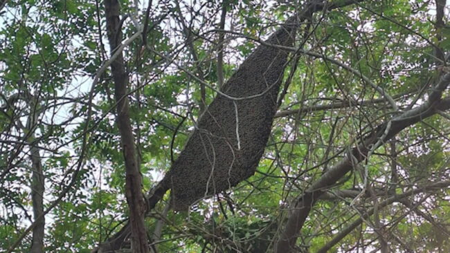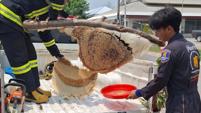ชาวบ้านถูกผึ้งหลวง 200 ตัวรุมต่อย กระโดดต้นไม้หนีตายเข้าไปหลบในห้องน้ำ ล่าสุดอาการปลอดภัย ขณะที่เจ้าหน้าที่กู้ภัยช่วยกันกำจัดรังผึ้ง พร้อมเตรียมนำไปเยี่ยมไข้คนเจ็บที่บ้าน
