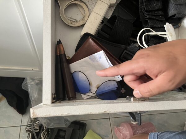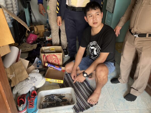 ต่อมาเจ้าหน้าที่ตำรวจ กก.4 บก.สอท.5 ได้ทำการตรวจค้นบ้านหลังดังกล่าว ผลการตรวจค้นพบอาวุธปืนทั้งที่มีทะเบียน และไม่มีทะเบียน รวม 9 กระบอก กระสุนปืนขนาดต่างๆรวมทั้งกระสุนปืนที่ใช้ในการสงคราม รวม 92 นัด ลูกระเบิดมือขว้าง แบบต่างๆ รวม 3 ลูก จากการสอบถามให้การรับว่าของกลางทั้งหมดเป็นของบิดาตน ซึ่งเสียชีวิตไปแล้ว และตนเองได้เก็บรักษาเอาไว้
