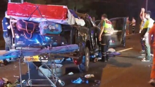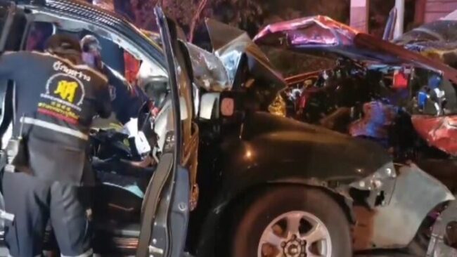บุรีรัมย์-เกิดอุบัติเหตุเศร้า สงกรานต์กลับไม่ถึงบ้าน กระบะข้ามเลนชนประสานงาหน้ายับทั้ง 2 คัน เสียชีวิตทันที 3 ศพ บาดเจ็บอีก 4 ราย มีเด็กหญิง 6 ขวบรวมอยู่ด้วย