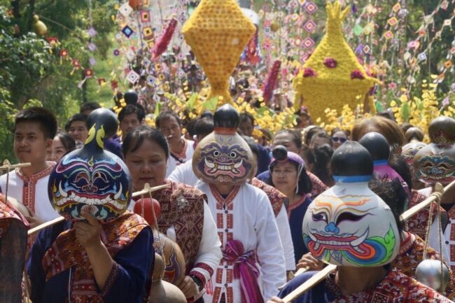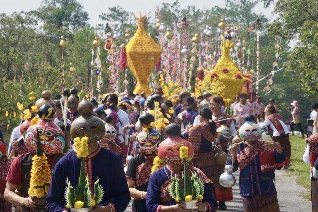 เมื่อกาลเวลาผ่านไปความเป็นอยู่ของชาวบ้านอยู่ร่มเย็นเป็นสุขมากขึ้น จึงเกิดความคิดสร้างสรรค์มาจากเยาวชนกลุ่มหนึ่งที่บ้านไฮตาก ได้คิดประดิษฐ์ทำหน้ากากผีบุ้งเต้าขึ้น โดยนำผลน้ำเต้าลูกใหญ่ ๆ มาทำเป็นวัสดุและวาดลวดลายให้เป็นหน้ากาก “ผีบุ้งเต้า” ซึ่งมีลักษณะเป็นรูปหน้ายักษ์ทวารบาลที่มีใบหน้าเปื้อนรอยยิ้ม ถือว่าเป็นยักษ์ที่ใจดี และได้เริ่มแต่งกายและสวมใส่หน้ากากผีบุ้งเต้ามาเข้าร่วมขบวนแห่เพื่อเป็นการสร้างสีสันและความสนุกสนานในประเพณีสรงน้ำพระพุทธนาวาบรรพต ให้เกิดขึ้นครั้งแรกตั้งแต่ปี พ.ศ. 2562 เป็นต้นมา