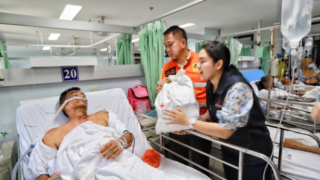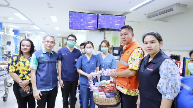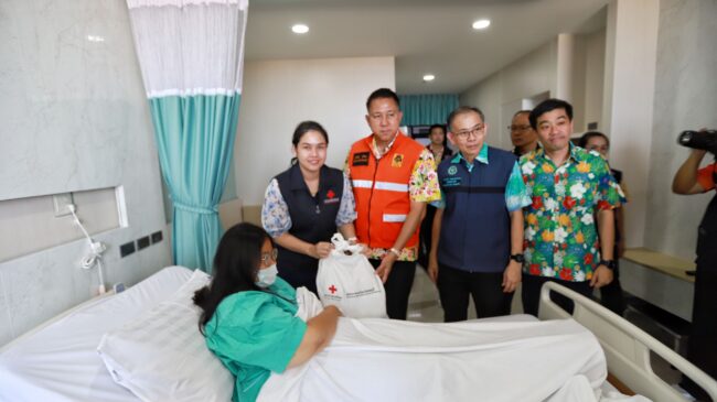 เมื่อเวลา13.00 น. วันที่ 18 เม.ย. 2567 นายธวัชชัย ศรีทอง ผู้ว่าราชการจังหวัดชลบุรี พร้อม นางสาวประภัสรา ศรีทอง นายกเหล่ากาชาดจังหวัดชลบุรี นายวีกิจ มานะโรจน์กิจ นายอำเภอบางละมุง นายแพทย์วิชัย ธนาโสภณ ผู้อำนวยการโรงพยาบาลบางละมุง พ.ต.อ.ทวี กุดแถลง ผกก.สภ.หนองปรือ เหล่ากาชาดจังหวัดชลบุรี หน่วยงานที่เกี่ยวข้อง ลงพื้นที่รุดเยี่ยมผู้บาดเจ็บจากเหตุการณ์สารแอมโมเนียรั่วไหลภายในโรงงานน้ำแข็ง ที่โรงพยาบาลบางละมุง พร้อมมอบถุงยังชีพสภากาชาดไทยเป็นการช่วยเหลือเบื้องต้น และพูดคุยให้กำลังใจผู้ป่วยที่นอนรักษาตัวอยู่ที่โรงพยาบาลบางละมุง