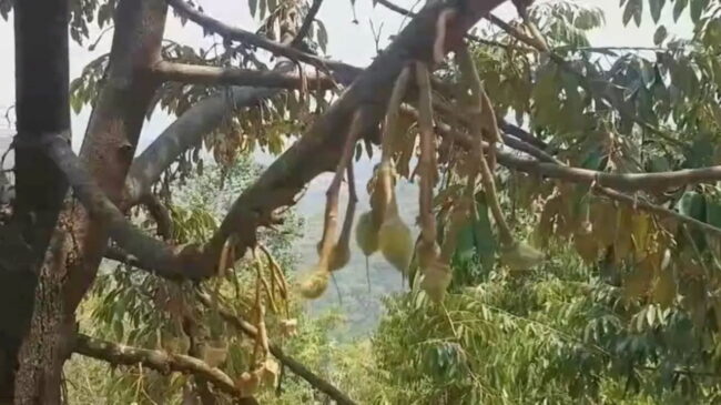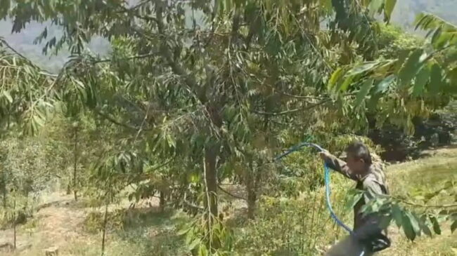 เจ้าของสวนทุเรียนที่ป่าผาตืม กล่าวต่อว่า แต่เมื่อเจอสภาพอากาศแห้งแล้ง น้ำในลำห้วยใกล้ๆ สวนแห้ง จึงเหมือนสกัดดาวรุ่ง ไม่มีน้ำรถต้นทุเรียน ต้นที่ปลูกใหม่เริ่มตาย ต้นที่กำลังออกผลผลิตกำลังได้รับผลกระทบ ชาวเกษตรกรต้องหาน้ำมาประคอง เร่งให้น้ำช่วยป้องกันต้นทุเรียนสลัดดอกและช่อผลทิ้ง ต้องขนน้ำใส่รถยนต์กระบะมารดน้ำทุเรียน แต่ก็ต้องแบ่งน้ำกันไปหลายสวน