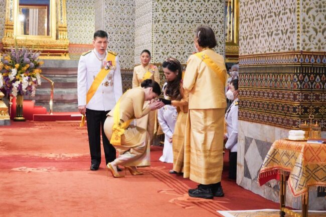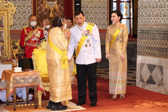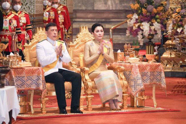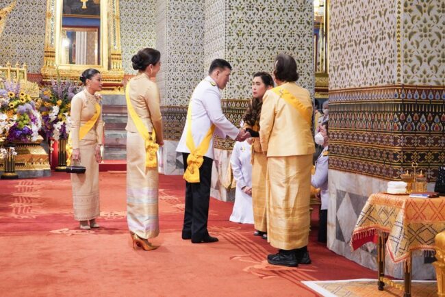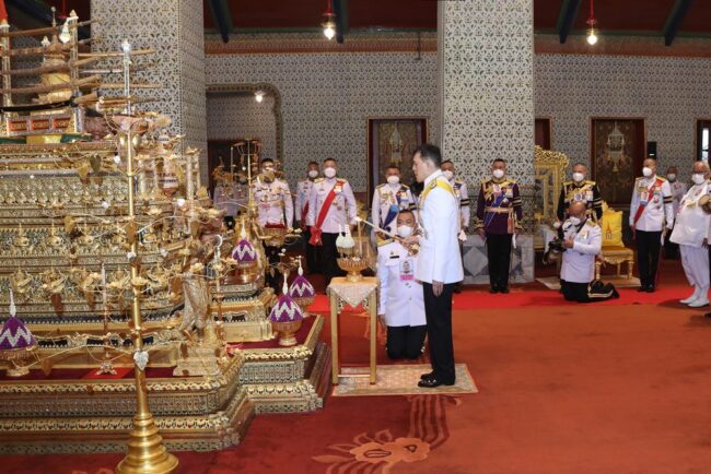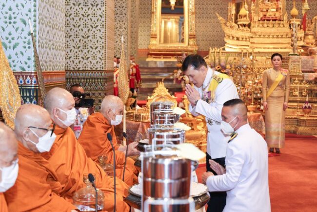 ทรงประเคนจตุปัจจัยไทยธรรมแด่สมเด็จพระราชาคณะ พระราชาคณะ เจ้าคณะรอง และพระราชาคณะ จนครบ 20 รูป ทรงหลั่งทักษิโณทก พระสงฆ์ถวายอนุโมทนา ถวายอดิเรก ถวายพระพรลา จากนั้น เสด็จพระราชดำเนินไปทรงจุดธูปเทียนเครื่องทองน้อยบูชาเทวดาที่รักษาพระนพปฎลมหาเศวตฉัตร เครื่องราชกกุธภัณฑ์ ทรงคม พราหมณ์เบิกแว่นเวียนเทียนสมโภชพระนพปฎลมหาเศวตฉัตร เครื่องราชกกุธภัณฑ์ ครบ 3 รอบ พระมหาราชครูพิธีศรีวิสุทธิคุณ ประธานพระครูพราหมณ์ เจิมพระนพปฎลมหาเศวตฉัตร…