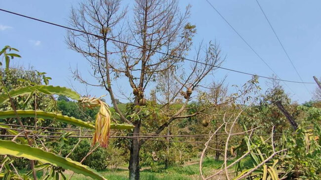 เนื่องจากอากาศและพื้นดินมีความร้อนมาก ไอน้ำระอุขึ้นมา จะส่งผลให้ต้นทุเรียนได้รับความเสียหายและอาจตายได้ ขณะที่สวนของตนนั้นก็แห้งตายไปเกือบ 10 ต้นแล้วเพราะแล้งขาดน้ำ และน่าเห็นใจในอีกหลายๆ สวน ที่ติดลูกแล้ว ประสบปัญหาลูกร่วงก็มี ยืนต้นตายก็มี บางรายลงทุนขุดบ่อบาดาลแต่ไม่เจอตาน้ำก็มีเช่นกัน ก็ต้องทำทุกทางให้มีน้ำรดต้นทุเรียนไปก่อนจนกว่าจะมีฝนตกลงมาในพื้นที่