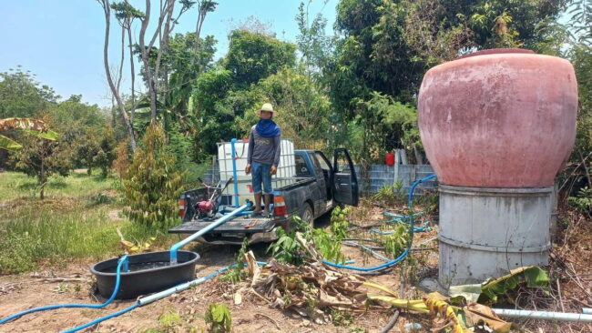 นายไพรบูรณ์ ไชยคำ อายุ 44 ปี ชาวบ้านน้ำมุด หมู่ 16 ต.บักดอง อ.ขุนหาญ จ.ศรีสะเกษ กล่าวว่า ตนนำน้ำมาจากเขื่อนห้วยทา ขับรถระยะทางกว่า 5 กิโลเมตรเพื่อเดินทางออกไปสูบน้ำมาใช้รดต้นทุเรียน เป็นแหล่งน้ำที่ใกล้ที่สุดในขณะนี้ ถ่ายใส่ตุ่มและบ่อปูนพักสำรองน้ำไว้ก่อน ซึ่งต้องใช้การลำเลียงขนย้ายกว่า 5-6 เที่ยวถึงจะเพียงพอในแต่ละวัน โดยจะรอเวลาในช่วงเย็น จึงปล่อยน้ำรดต้นทุเรียนทั้งหมด เพราะหากรดน้ำในช่วงที่แดดแรงจัด