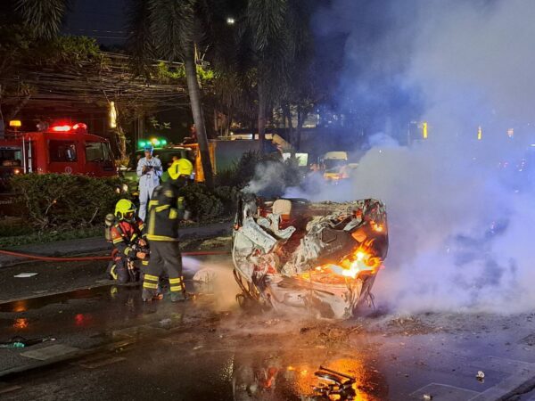 สลด เก๋งเสียหลัก พุ่งเสยเกาะกลางถนน พลิกคว่ำหงายท้องล้อชี้ฟ้า ไฟลุกพรึ่บไหม้วอดทั้งคัน คลอกร่างคนขับ เสียชีวิตคาที่ เอกสาร-รูปถ่ายกระเด็นออกมานอกรถ