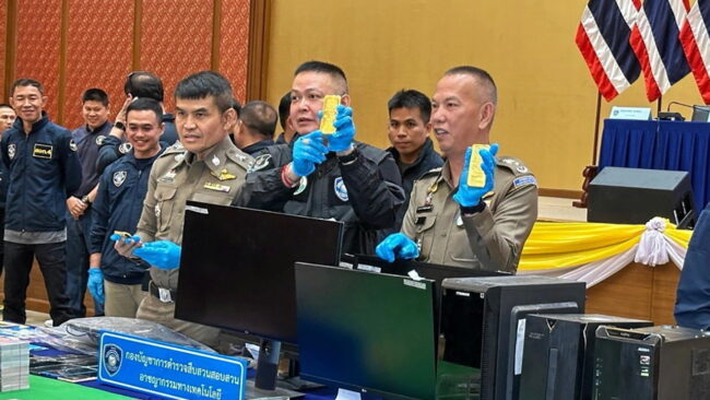 เมื่อวันที่ 25 พ.ค.67 ณ.อาคารสัมมนาและฝึกอบรม สำนักงานตำรวจแห่งชาติ (เมืองทองธานี) นำโดย พล.ต.ท.วรวัฒน์ วัฒน์นครบัญชา ผบช.สอท. พร้อมด้วย พล.ต.ต.วิวัฒน์ คำชำนาญ รอง ผบช. สอท, พล.ต.ต.จิตติพล ผลพฤกษา ผบก.สอท.4 พ.ต.อ.ขจร อบทอง รอง ผบก.สอท.2 และ พ.ต.อ.บัญชา ศรีสุขรอง ผบก.สอท.5 พร้อมเจ้าหน้าที่ที่เกี่ยวข้องร่วมแถลงข่าว ปฏิบัติการFULL STEAM กรณีกรณีตำรวจไซเบอร์ บุกค้นรังเงินกู้นอกระบบพัทลุงพร้อมยึดทรัพย์กว่า 10 ล้าน สืบเนื่องจากเจ้าหน้าที่ตำรวจไซเบอร์ได้สืบสวนหาเบาะแสการกระทำผิดเกี่ยวกับการพนันออนไลน์ เพื่อดำเนินการตามนโยบายเร่งด่วนของนายกรัฐมนตรีและสำนักงานตำรวจแห่งชาติ กระทั่งพบข้อมูลว่ามีการลักลอบเปิดให้เล่นพนันออนไลน์ผ่านระบบอินเตอร์เน็ตโดยประชาชนคนไทยโดยทั่วไปสามารถเข้าถึงได้ จำนวน 2 เครือข่าย