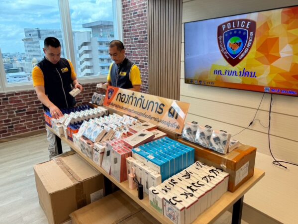 ตำรวจสอบสวนกลาง (CIB) เจ้าหน้าที่ชุดจับกุม พร้อมตรวจยึดของกลาง 1.แบตเตอรี่สำรองแบบพกพา (พาวเวอร์แบงค์) จำนวน 1,333 หน่วย 2.เครื่องจ่ายไฟฟ้าสำหรับ โทรศัพท์เคลื่อนที่และแท็บเล็ต (อะแดปเตอร์) จำนวน 17,039 หน่วย