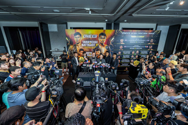 วัน แชมเปียนชิพ (ONE) องค์กรศิลปะการต่อสู้ที่ยิ่งใหญ่ที่สุดในโลก แถลงข่าว-ซ้อมโชว์สื่อมวลชน ศึก ONE 167: ตะวันฉาย vs โจ II ในวันพุธที่ 5 มิถุนายน 2567 โดยมีเหล่านักกีฬาระดับซูเปอร์สตาร์-ดาวรุ่งที่ลงทำการแข่งขัน รวมทั้งทัพสื่อมวลชนหลายร้อยสำนัก อินฟลูเอนเซอร์, แฟนคลับ เข้าร่วมงานมากมาย