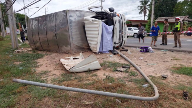 รถหกล้อโรงน้ำแข็งจากราชบุรี วิ่งส่งร้านค้าใน อ.ปากท่อ เสียหลักพลิกคว่ำไถลไปฟาดเสาไฟฟ้าริมถนน เสียชีวิตทั้งคัน ทั้งคนขับคนงานแบกน้ำแข็ง ดับคาที่ 3 ศพ
