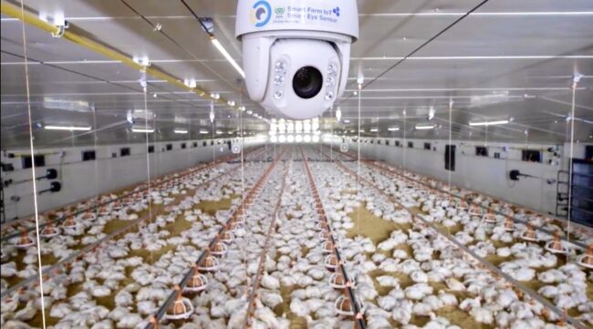 ในขณะเดียวกัน มีการใช้กล้องติดตามสภาพแวดล้ อมภายในโรงเรือน รวมถึงความเป็นอยู่ของสัตว์ให้ อยู่อย่างสุขสบาย ได้แสดงพฤติกรรมของสัตว์อย่างมี ความสุข อยู่สบาย จะกินน้ำกินอาหารดี และมีการนอนอาบแกลบ ซึ่งจะเป็นตัวบ่งบอกว่า สัตว์อยู่สบาย เมื่อสัตว์มีความสุข สุขภาพดี สวัสดิภาพสัตว์จะดีตามด้วย ส่งผลทำให้สัตว์เจริญเติบโตได้ ดี และได้เนื้อไก่ที่มีคุ ณภาพปลอดภัยต่อผู้บริโภค