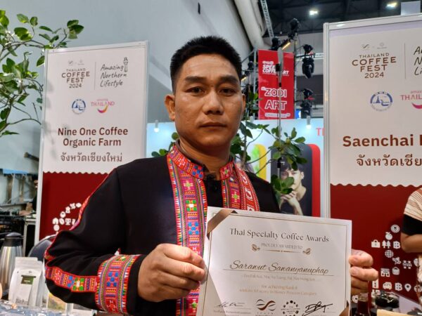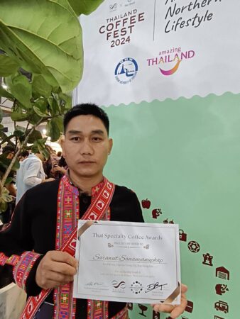 ศราวุฒิ ศวรรยานุภาพ เกษตรกรผู้ปลูกกาแฟ อ.ปาย จ. แม่ฮ่องสอน เพิ่งรางวัลอันดับที่ 8 ประเภทโพรเซส ฮันนี่ภายในงาน Thailand Coffee Fest 2024 ที่ไร่ทำการเพาะปลูกกาแฟสายพันธุ์อราบิก้า , Typica , คาติมอร์ และคาททูร์รา ซึ่งขบวนการผลิตจะใช้น้ำผึ้งป่าจากธรรมชาติมาหมกกับกาแฟ เพื่อนำมาแปรรูปเอาน้ำกาแฟออกมา สร้างความเข้มข้น กลิ่นหอม ชวนดื่มเหมือนมีกลิ่นน้ำผึ้งป่า