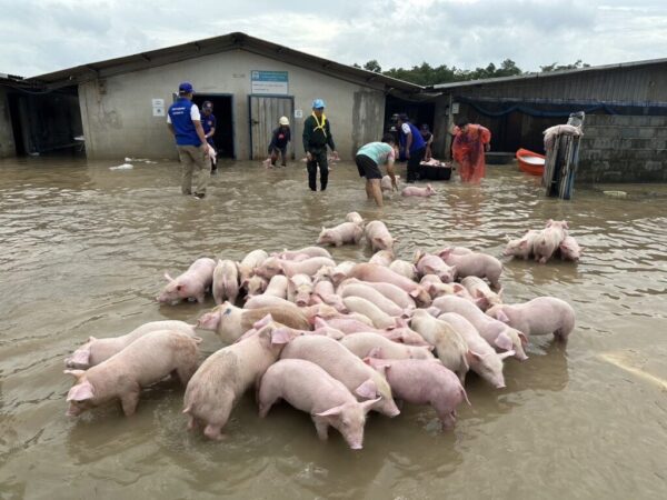 ฝนที่ตกลงมาตลอดทั้งวันในพื้นที่จ.ตราดส่งผลให้น้ำท่วมหลายพื้นที่ นายพีระ เอี่ยมสุนทร รองผู้ว่าราชการจังหวัดตราด นายพงษ์พัฑฒ์ สินราย นายอำเภอเขาสมิง พร้อมด้วย ปศุสัตว์ จ.ตราด ตำรวจ ทหารจากหน่วยเฉพาะกิจนาวิกโยธินตราด กำนัน ผู้ใหญ่บ้าน และเจ้าหน้าที่จาก อบต.แสนตุ้ง รวมทั้งชาวบ้าน ได้ร่วมช่วยกันขนย้ายหมูอายุตั้งแต่ 14 วัน 1 เดือน และ 2 เดือนกว่า 8,000 ตัว ที่ ฟาร์มณรงค์ศักดิ์ อภิพัฒน์ ฉัตรชัย ลินดา ฟาร์ม อ.เขาสมิง จ.ตราด ออกจากฟาร์มเนื่องจากถูกน้ำท่วม ขนไปไว้ที่ฟาร์ม จำเรียง กับ สุรพล ฟาร์ม อยู่ที่ หมู่ 4 แสนตุ้ง อ.เขาสมิงแทน เพราะเป็นฟาร์มที่สูงไม่ถูกน้ำท่วม