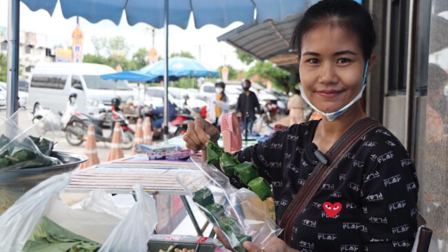 นางสาวอมรรัตน์ บุญรุ่ง หรือ “หญิง” เจ้าของร้านเมี่ยงคำสมุนไพรสูตรแม่ขจร หนึ่งในเมี่ยงคำที่ใครไปใครมาบริเวณลานโพธิ์ จะพบเจอร้านเมี่ยงคำแม่ขจร ตั้งวางขายและทำกันแบบสดๆ เล่าให้เราฟังว่า ในทุกๆ วันตั้งแต่เช้าไปจนถึงช่วงบ่ายๆ มีผู้คนแวะเวียนมาอุดหนุนกันไม่ขาดสาย แต่ส่วนมากจะเลือกสั่งออนไลน์หรือไม่ก็โทรสั่งไว้แล้วค่อยมารับหรือให้ไปส่งก็มี