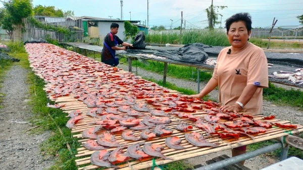 เจ้าของแผงขายปลาสลิดใน จ.ฉะเชิงเทรา พลิกวิกฤตเป็นโอกาสประกาศรับซื้อปลาหมอคางดำ ในราคากก.ละ 10-15 บาท แปรรูปเป็นปลาหมอคางดำแดดเดียว ขาย กก.ละ 80-90 บาท ถูกกว่าปลาสลิดแดดเดียวถึง 3 เท่าตัว ทำชาวบ้านแห่ซื้อเพื่อประหยัดค่าใช้จ่าย
