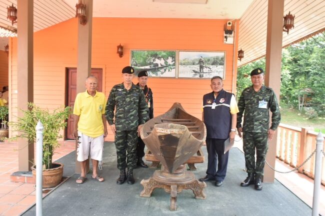 ด้าน นาย กรีฑา แดงดี รองประธานสมาพันธ์ไทยพุทธ จังหวัดนราธิวาส ชาวบ้านในหมู่บ้านบากง ได้เล่าถึงประวัติความเป็นมาของเรือลำดังกล่าวว่า เมื่อสมัยก่อน เรือลำนี้อยู่ที่วัดทรายทอง ต.บากง อ.รือเสาะ (วัดบ้านบากง) ซึ่งเป็นของหลวงพ่อท่านดำ เจ้าอาวาสวัดทรายทอง ซึ่งท่านดำได้ขอไม้จากชาวบ้านเพื่อนำมาขุดเรือไว้บิณฑบาตในหน้าน้ำท่วมเพื่อให้เข้าถึงชาวบ้านให้ง่ายขึ้น ต่อมาเรือลำดังกล่าวก็ได้เก็บไว้ที่วัด และเมื่อพระบาทสมเด็จพระเจ้าอยู่หัวภูมิพลอดุลยเดช จะเสด็จมาเยี่ยมราษฏรในพื้นที่จึงได้นำเรือขุดลำดังกล่าวมาใช้เป็นเรือพายสำหรับพระบาทสมเด็จพระเจ้าอยู่หัว ใช้ทรงงาน ต่อมาเมื่อปี 2529 สมเด็จพระบรมโอรสาธิราช เจ้าฟ้ามหาวชิราลงกรณสยามมกุฎราชกุมาร ก็เคยประทับเรือลำนี้เพื่อทอดพระเนตรทัศนียภาพในบึงบัวบากงด้วย “สำหรับเรือประทับทรงงานลำนี้ เป็นเรือขุดใช้แรงงานคน ทำด้วยไม้หลุมพอ มีความยาว 5 เมตร 50 เซนติเมตร ความกว้างกลางลำเรือ 88 เซนติเมตร และความลึก 22 เซนติเมตร ด้วยความร่วมมือร่วมใจของชาวบ้านในพื้นที่ได้เก็บรักษาเรือลำนี้ไว้บริเวณศาลาทรงงานบึงบัวบากง