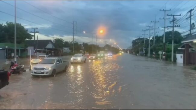 นครราชสีมา-ฝนตกหนักท่วมฉับพลันในพื้นที่ อ.โชคชัย จ.นครราชสีมา เนื่องจากระบายไม่ทัน เอ่อท่วมผิวจราจร ถนนสาย 224 ราชสีมา-โชคชัย ช่วงผ่าน ต.ด่านเกวียน อ.โชคชัย ตั้งแต่หน้าโรงเรียนอนุบาลแสนสนุก , แหล่งจำหน่ายสินค้าเครื่องปั้นดินเผาด่านเกวียน ไปจนถึงโรงเรียนบ้านด่านเกวียน และมีน้ำป่าไหลหลากจากพื้นที่สูงเข้ามาสมทบด้วย ทำให้ระดับน้ำท่วมสูงต่อเนื่อง รถสัญจรลำบากโดยเฉพาะรถขนาดเล็กไม่สามารถสัญจรผ่านได้ นอกจากนี้ ในช่วงที่มีรถเคลื่อนผ่าน ได้ทำให้มวลน้ำซัดไหลหลากเข้าบ้านเรือน ชุมชน และร้านค้าที่อยู่ริมทาง ทำให้ข้าวของได้รับความเสียหาย