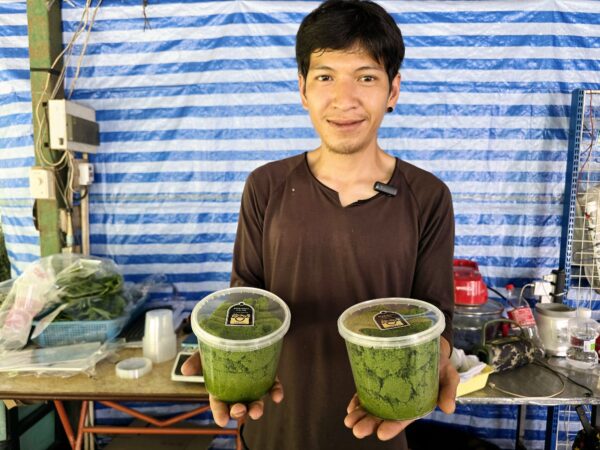 นายชยพล ชาญวิรวงศ์ หรือ หยาง ผู้ปลูกไข่ผำ อายุ 34 ปี บอกว่า เริ่มต้นที่ผมมาทำไข่ผำคือโดยปกติแล้วผมก็เป็นคนปลูกผักที่มีธาตุอาหารสูงอย่างเช่นพวกผักเคล หรือซุปเปอร์ฟู้ดต่างๆ เกิดความสนใจก็เลยหาข้อมูลแล้วก็ได้ไปเจอเจ้าไข่ผำครับซึ่งเป็นพืชจิ๋ว พืชน้ำ เลี้ยงง่าย แล้วก็ขยายพันธุ์ได้เร็วด้วยครับ ผมก็เลยสนใจอยากจะมาเลี้ยงดู ส่วนคุณค่าทางอาหารเห็นจิ๋วๆแบบนี้นะครับมีคุณประโยชน์มากมายเลยครับ ผมว่ามีวิตามิน มีโปรตีน มากกว่าผักบางชนิดที่เราทานกันอยู่ครับ