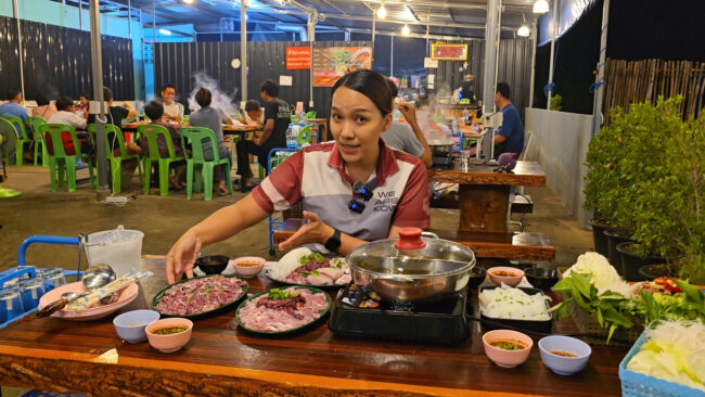 “ร้านจึงเปิดรับลูกค้ามานั่งรับประทานในร้าน จากเดิมมี 8 โต๊ะ และต้องเพิ่มโต๊ะเรื่อยๆจนถึงปัจจุบันมีทั้งหมด 21 โต๊ะ นั่งได้ 5-10 คน และในขณะนี้กำลังเตรียมขยายพื้นที่ร้านออกไปอีก เพราะมีลูกค้ามานั่นในร้านเพิ่มมากขึ้น โดยเมนูเด็ดของร้านคือแจ่วฮ้อนเนื้อน่องลาย ไม่มีเนื้อส่วนอื่นผสม แจ่วฮ้อนหมู และแจ่วฮ้อนปลา จำหน่ายในราคาชุดละ 220 และชุดใหญ่ ราคา300 บาท โดยมีน้ำซุปที่รสชาติอร่อยเคี่ยวด้วยเตาถ่าน เสริฟด้วย น้ำจิ้มแซบ 3 อย่าง จิ้มขม จิ้มเผ็ด จิ้มซีฟู๊ด ให้ลูกค้าเลือกได้ตามใจชอบ น้ำซุปจะต้มและเคี่ยวด้วยเตาถ่าน ซึ่งร้าน เปิดขายทุกวัน ไม่มีวันหยุดตั้งแต่เวลา15.30 -22.00 น.”