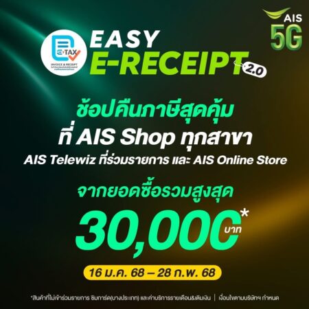 Read MoreAIS ขานรับมาตรการ “Easy E-Receipt 2.0” หนุนเศรษฐกิจปี 2568 ช้อปลดภาษีสูงสุด 30,000 บาท
