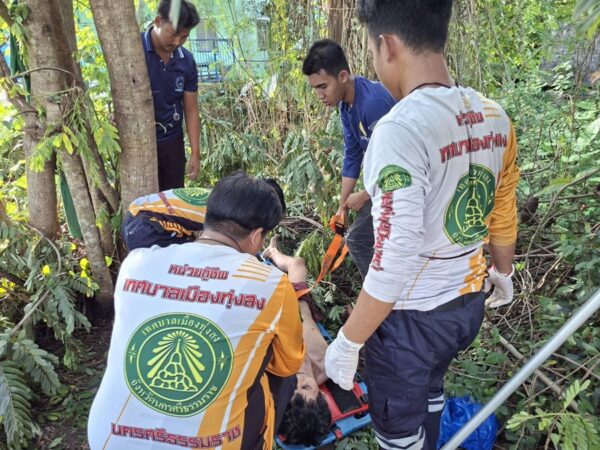 พ่อเฒ่าวัย 60 ปีปีนเก็บยอดขี้เหล็กถูกกิ่งหนีบติดคาต้น ร้องขอชีวิตกลางแดดนานครึ่งวัน